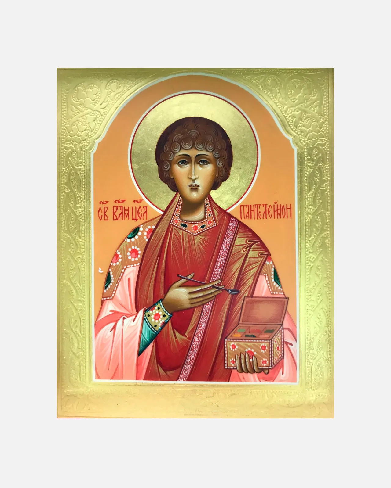 Святой представлен в красном хитоне, символизирующем мученический подвиг. В руке целитель держит ковчежец с мазями и врачебный инструмент — напоминание о его искусстве врачевания телесных и душевных недугов. Лик святого исполнен кротости, его темные кудри обрамляют светлый лик, а золотой нимб сияет символом вечной жизни.