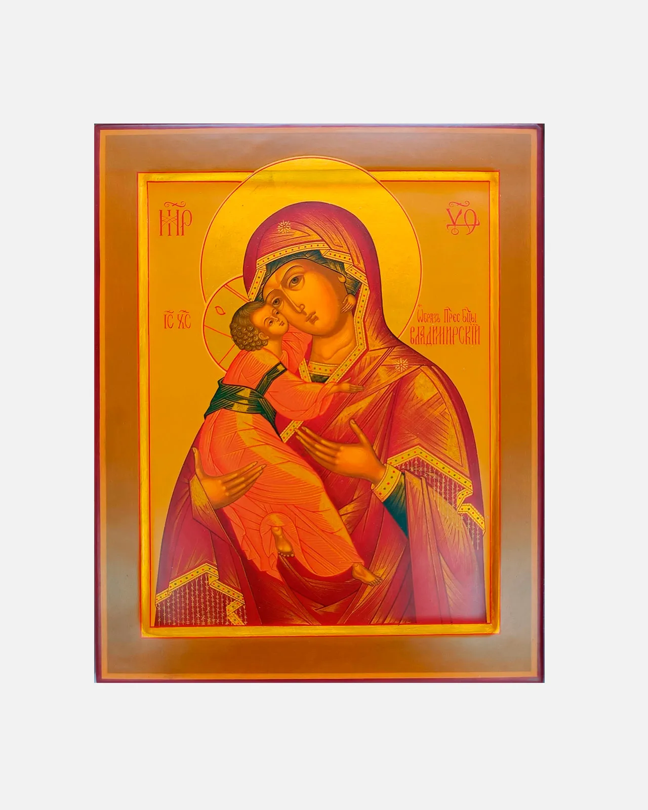 Это великолепная икона Богоматери Владимирской, выполненная в традиционном стиле русской иконописи, с размерами 32х26 см. На полотне изображена Матерь Божия в тонких, изысканных одеждах, держащая на руках Младенца Христа. Икона украшена золотым нимбом и богатыми орнаментами, а также содержит традиционные надписи в углах, а также название «Богоматерь Владимирская» в правом нижнем углу. Цветовая палитра — глубокие красные, золотые и оранжевые тона — придаёт изображению торжественность и духовную силу, подчёркивая её священное значение. Икона представляет собой не просто предмет религиозного украшения, а настоящий художественный объект, способный стать центром духовного пространства в доме или храме. Она идеально подойдёт для установки в прихожей, на алтаре или в качестве особого подарка. Высокое качество исполнения, тщательная работа с деталями и благородные материалы делают её долговечной и ценной. Икона Богоматери Владимирской — это не только символ веры, но и уютное напоминание о милосердии и защите, охраняющей икону и её владельца.