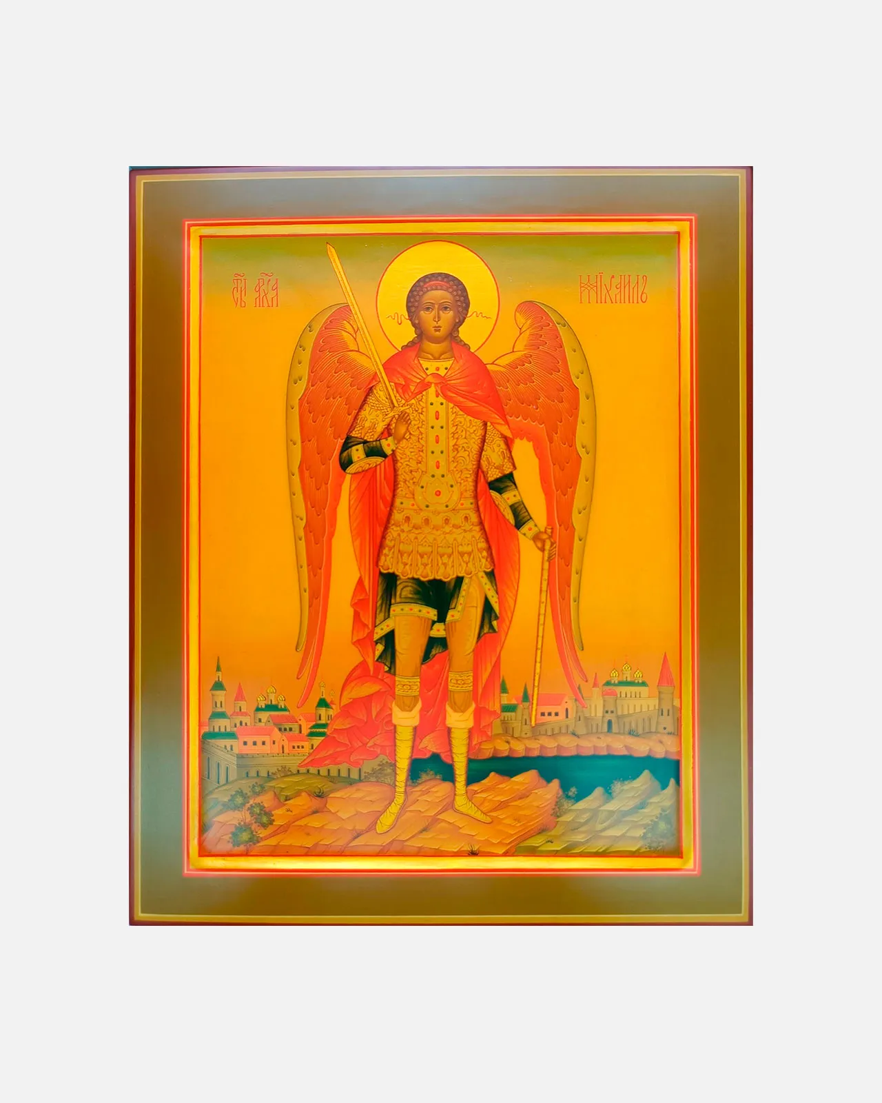 Образ заключен в многослойную раму: червонный цвет символизирует царственность, оливковый — духовное возрастание, черный — границу миров. В центре предстает Архангел Михаил в золотых доспехах с изысканным орнаментом и алой накидкой. Его огненные крылья и нимб указывают на светоносную природу. В правой руке он возносит меч, рассекающий зло, в левой — держит копье, готовый защитить каждого верующего.